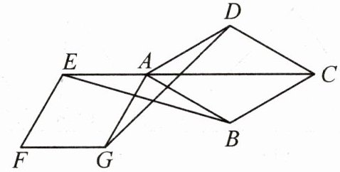 16. 如图,E是菱形ABCD对角线CA的延长线上一点,以线段AE为边作一个菱形AEFG,且菱形AEFG∽菱形ABCD,相似比是$\sqrt{3}:2$,连接EB,GD.