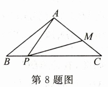 8. 如图,在$\triangle ABC$中,$AB= AC= 5,BC= 8$,P为边BC上一动点(不与点B,C重合),过点P作射线PM交AC于点M,使$∠APM= ∠B$。当$BP= 2$时,CM的长为