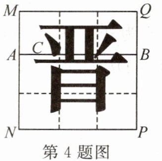 4. 新考向 跨学科(2024·山西)黄金分割是汉字结构最基本的规律.借助如图所示的正方形习字格书写的汉字“晋”端庄稳重、舒展美观.已知一条分割线的端点A,B分别在习字格的边MN,PQ上,且AB//NP,“晋”字的笔画“、”的位置在AB的黄金分割点C处,且$\frac {BC}{AB}= \frac {\sqrt {5}-1}{2}$.若NP= 2cm,则BC的长为