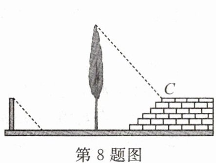 8. 数学兴趣小组的同学们想利用树影测量树高. 课外活动时他们在阳光下测得一根长为1米的竹竿的影子是0.9米,同一时刻测量树高时,发现树的影子不全落在地面上,有一部分影子落在教学楼的台阶上,且影子的末端刚好落在最后一级台阶的上端C处. 他们测得落在地面的影长为1.1米,台阶总的高度为1米,台阶水平总宽度为1.6米,则树高为 (