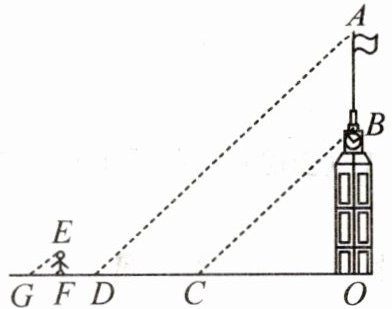 解:由题意可得,$ AD // EG $,$\therefore \angle ADO = \angle EGF $。$\because \angle AOD = \angle EFG = 90^\circ $,$\therefore \triangle AOD \backsim \triangle EFG $。$\therefore \frac{AO}{EF} = \frac{OD}{FG} $,即 $\frac{AO}{1.8} = \frac{50}{2.4} $。$\therefore AO = 37.5 $。同理可得 $\triangle BOC \backsim \triangle AOD $,$\therefore \frac{BO}{AO} = \frac{OC}{OD} $,即 $\frac{BO}{37.5} = \frac{30}{50} $。$\therefore BO = 22.5 $。$\therefore AB = AO - BO = 37.5 - 22.5 = 15 $(米)。答:旗杆的高 $ AB $ 是 15 米。