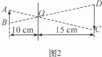 9. 新考向 跨学科 小孔成像是光在均匀介质中沿直线传播形成的一种物理现象。两千四百多年前,我国学者墨子就在《墨经》中记载了小孔成像实验的做法与成因,图1是某次小孔成像实验图,抽象为数学问题如图2:$AC与BD交于点O$,$AB // CD$。若点$O到AB的距离为10cm$,点$O到CD的距离为15cm$,蜡烛火焰$AB的高度是3cm$,则蜡烛火焰倒立的像$CD$的高度是 (