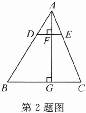 2. 如图,已知$\triangle ADE \backsim \triangle ABC$,相似比为$1:3$,过点$A作AG \perp BC于点G$,交$DE于点F$,则$AF:FG= $ (