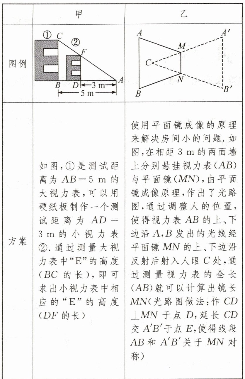 13. 新考向 真实情境 近年来,我国近视发生率呈明显上升趋势,近视已成为影响我国国民尤其是青少年眼健康的重大公共卫生问题。为了加强视力保护意识,小北想在书房里挂一张测试距离为$5m$的视力表,但两面墙的距离只有$3m$。在一次课题学习综合实践课上,小北向全班同学征集“解决空间过小,如何放置视力表问题”的方案,其中甲、乙两位同学设计方案新颖,构思巧妙。