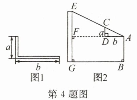 4. 西周数学家商高总结了用“矩”(如图1)测量物高的方法:把矩的两边按图2放置,从“矩”$CDA的一端A$(人眼)望点$E$,使视线通过“矩”的另一端点$C$,记人站立的位置为点$B$,量出$BG$的长,即可算得物高$EG$。若$a = 30cm$,$b = 60cm$,$AB = 1.6m$,$BG = 2.4m$,则$EG$的高度为(