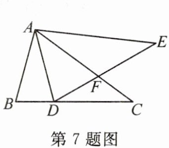 7. 如图,在$\triangle ABC$中,$AB < AC$,将$\triangle ABC绕点A逆时针旋转得到\triangle ADE$,点$D在边BC$上,$DE交AC于点F$。若$AC = 8$,$BD = 2$,$BC = 6$,则$\frac{DF}{AF} = $