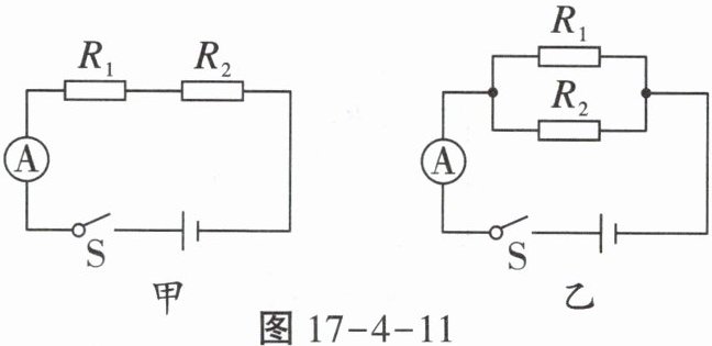 9. 将阻值不同的电阻$R_{1}$、$R_{2}$按图17-4-11甲所示电路连接,闭合开关S后,电流表的示数为0.6A;保持电源电压不变,再将电阻$R_{1}$、$R_{2}$按图17-4-11乙所示电路进行改接。闭合开关S后,关于电流表的示数,下列说法正确的是(