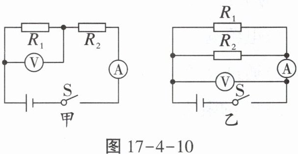 8. 如图17-4-10所示的电路,电源电压相同且保持不变。图甲中,闭合开关S,电压表的示数为4V,电流表的示数为0.4A;图乙中,闭合开关S,电压表的示数为6V。求:(1)$R_{1}$、$R_{2}$的阻值;(2)图乙中电流表的示数。
