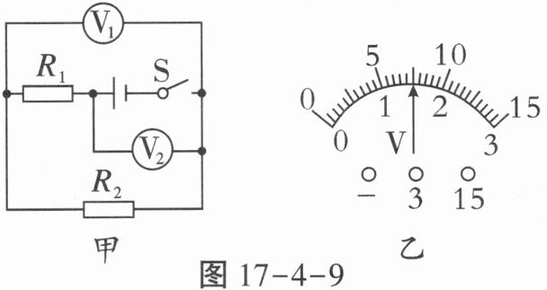 7. 如图17-4-9甲所示的电路,闭合开关后两只电压表的指针偏转均如图17-4-9乙所示,则$R_{1}$两端的电压为