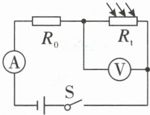 (2024 绥化)如图所示的电路,R₀是定值电阻$,R_1$是阻值随光照强度增大而减小的光敏电阻。闭合开关S,逐渐增大光敏电阻的光照强度,关于两个电表示数的说法中,正确的是( )A.电压表和电流表的示数都增大B.电压表和电流表示数的比值增大C.电流表示数减小,电压表示数增大D.电流表示数增大,电压表示数减小