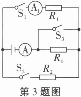 3. (2024 重庆一外月考)如图所示,电源两端电压不变,电阻$R_{1}= 30\Omega$,$R_{2}= 60\Omega$。当只闭合开关$S_{1}$、$S_{3}$时,电流表$A_{1}$的示数为0.4A。当只闭合开关$S_{1}$时,电流表A的示数为$I_{1}$;当只闭合开关$S_{2}$、$S_{3}$时,电流表A的示数为$I_{2}$。已知$I_{1}:I_{2}= 1:2$,各电路元件均正常工作,求:(1)电源电压;(2)$R_{0}$的电阻值;(3)该电路的最大电流与最小电流之比。