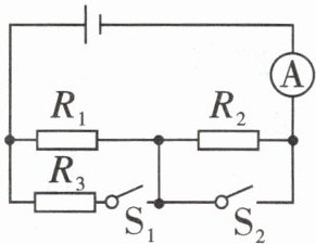 解:(1)当$S_{1}$、$S_{2}$都断开时,$R_{1}与R_{2}$串联,电流表测电路中的电流,则电源电压:$U= I(R_{1}+R_{2})= 0.3A×(20\Omega+20\Omega)= 12V$;(2)当$S_{1}$、$S_{2}$都闭合时,$R_{1}与R_{3}$并联,电流表测干路电流,则电路中的总电阻:$R= \frac{R_{1}R_{3}}{R_{1}+R_{3}}= \frac{20\Omega×20\Omega}{20\Omega+20\Omega}=10\Omega$,电流表的示数:$I'= \frac{U}{R}= \frac{12V}{10\Omega}=1.2A$。