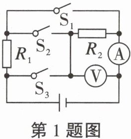 1. 如图所示,电源电压恒定不变,只闭合开关$S_{2}$,电流表的示数为0.3A,电压表的示数为3V,则$R_{2}$的阻值为