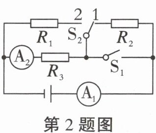 2. (2024 江西)如图所示,三个电阻$R_{1}$、$R_{2}$、$R_{3}$的阻值均相同,当开关$S_{1}$断开、开关$S_{2}$掷到1时,电流表$A_{1}与电流表A_{2}$的示数之比为