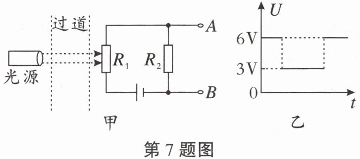 7.小江为停车场设计了一个记录车辆数的自动计数器,其简化电路如图甲所示,其中$R_1$是光敏电阻,当汽车挡住了射向$R_1$的红外线时,$R_1$的电阻会变小为20Ω,这时自动计数器计数一次,$R_2$是定值电阻,已知电源电压为9V,某时段AB间的电压随时间变化的图像如图乙所示,则$R_2$的阻值为