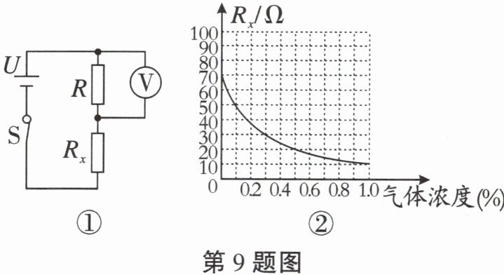 9.(2024镇江)如图①所示是小华设计的天然气浓度测试仪,电源电压U恒为4V,R为定值电阻,电压表量程为0~3V,将电压表作为气体浓度的显示装置,气敏电阻$R_x$阻值与气体浓度的关系如图②所示,当气体浓度增加时,$R_x$的阻值将