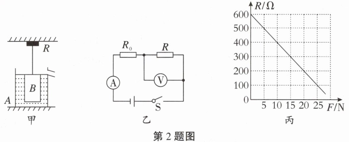 2.(2024南开中学期中)如图甲所示为小渝同学设计的测液体密度的装置。A为轻质薄壁溢水杯,圆柱体B的重力为30N,用细线与力敏传感器R相连,R的阻值随拉力变化的图像如图丙所示,B的上表面与溢水口相平;图乙为R所在的电路,电源电压$U= 6\mathrm{V}$,$R_0= 100\Omega$,电压表V的量程为0~5V,电流表A的量程为0~0.03A。向溢水杯中加满水,电流表的示数为0.02A。($g取10\mathrm{N/kg}$)求: