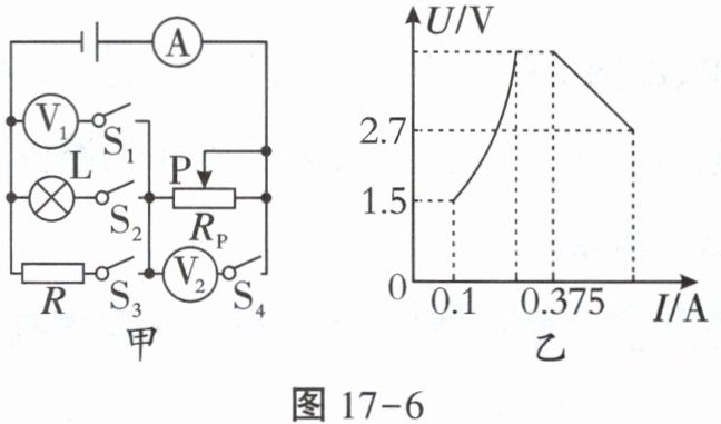 8.(2024 重庆八中期中)如图甲所示,电源电压保持不变,滑动变阻器Rₚ标有“60Ω 1A”字样,电流表的量程为0~0.6A,电压表的量程均为0~15V。先闭合开关$S_1、$$S_2,$断开开关$S_3、$$S_4,$在保障电路元件安全的情况下,将滑动变阻器的滑片P从最右端滑动到m点,灯泡L恰好正常发光;再断开开关$S_1、$$S_2,$闭合开关$S_3、$$S_4,$将滑动变阻器的滑片P从m点向左移动到最大程度。如图乙所示是两次调节过程中电流表与电压表示数变化关系图像,则下列说法错误的是(