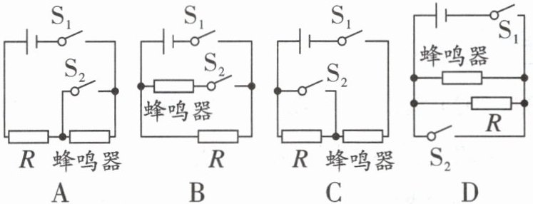 6.(2024 大渡口区二模)为避免立定跳远测试起跳时过线犯规,学校引进了一批体育练习装置。装置的基本原理是:当有同学踏上练习垫时,开关$S_1、$$S_2$同时闭合,当装置感应到脚尖过线,红外感应开关$S_2$断开,蜂鸣器发出声音提醒同学犯规。下列能实现上述功能的电路图是(