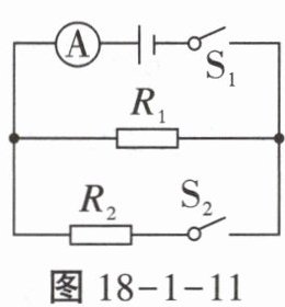 9. 如图18-1-11所示的电路,电源电压保持不变,只闭合$S_{1}$,电流表的示数为0.3A,再闭合$S_{2}$,电流表的示数变化了0.4A,则同时闭合$S_{1}$、$S_{2}$后,相同时间内$R_{1}$、$R_{2}$消耗的电能之比为(