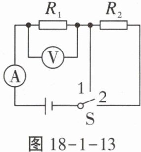 11. 如图18-1-13所示,电源电压为6V且保持不变,电阻$R_{1}= 10\Omega$,$R_{2}= 20\Omega$。当开关S接2时,电压表的示数为