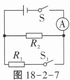 6. 如图18-2-7所示,电源电压6V恒定,闭合S、断开$S_{1}$,电流表读数为0.2A;若再闭合$S_{1}$,发现电流表示数变化了0.3A,则$R_{1}$的阻值为______Ω,$R_{2}$消耗的功率为______W。
