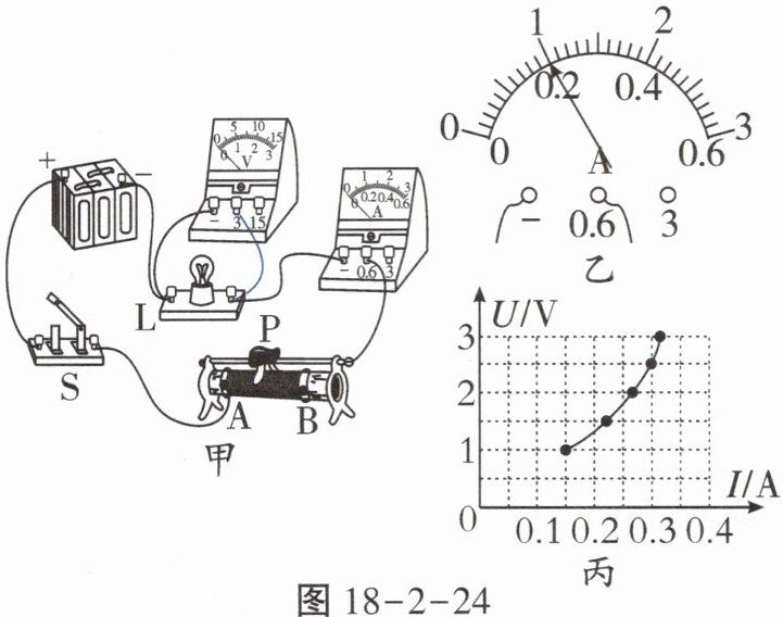 (5)继续移动滑片P,让电压表的示数低于2.5V,某时刻电流表的示数如图18-2-24乙所示,为_____A。观察灯泡亮度并记录电表示数;继续缓慢移动滑片P,让电压表的示数高出2.5V少许,观察灯泡亮度并记录电表示数。小华根据所有实验数据作出了小灯泡的U-I图像(如图18-2-24丙所示),则小灯泡的额定功率为_____W。