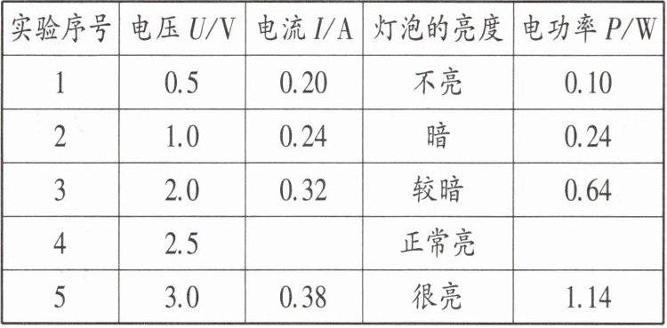 实验序号 电压U/V 电流I/A 灯泡的亮度 电功率P/W