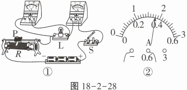 ①小灯泡L在额定电压下工作时,电流表的指针位置如图18-2-28②所示,则电流表的示数为_____A,小灯泡L的额定功率为_____W;