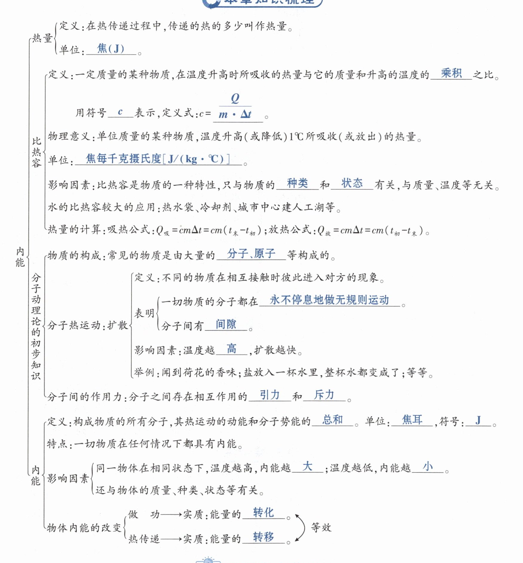 热量的计算:吸热公式:$Q_{吸}= cm\Delta t= cm(t_{末}-t_{初})$;放热公式:$Q_{放}= cm\Delta t= cm(t_{初}-t_{末})$。