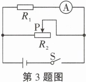 3.如图所示的电路,电源电压恒为6V,滑动变阻器$R_{2}$标有“20Ω 3A”字样。闭合开关S,电流表的示数为0.3A。求:(1)$R_{1}$的阻值;(2)$R_{2}$允许接入电路的最小阻值;(3)整个电路允许消耗的最大功率与最小功率之比。
