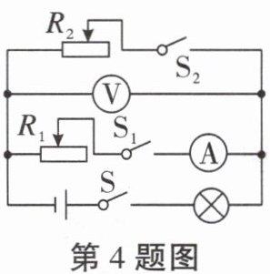 4. (2024 眉山)如图所示的电路,电源电压恒为10V,$R_2$的最大阻值是20Ω,电流表的量程为0~0.6A,电压表的量程为0~15V,$R_1和R_2$允许通过的最大电流是1A。在保证所有元件安全的情况下:闭合S、$S_1$,断开$S_2$,移动$R_1$的滑片,电流表的示数变化范围是0.25~0.5A,电压表的最大示数是8V;若闭合S、$S_2$,断开$S_1$,移动$R_2$的滑片,当$R_2的阻值最小是R'$时,电压表的示数是4V。下列结论中正确的是 (