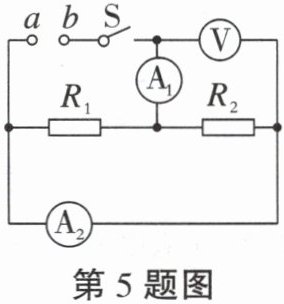 5. (2024 重庆八中开学)在如图所示的电路中,电阻$R_1$标有“6Ω 1A”,$R_2$标有“3Ω 1.2A”,电流表$A_1$、$A_2$的量程均为0~0.6A,电压表的量程为0~3V,在a、b间接入电压可调的电源。闭合开关S后,则电源电压最大为