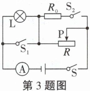 3. 如图所示,电源电压保持不变,定值电阻$R_0$= 15Ω,小灯泡标有“6V 3W”字样(假设灯丝电阻不变),电流表的量程为0~3A。当只闭合开关S,滑动变阻器的滑片P从阻值最大处移动到某一位置时,滑动变阻器连入电路中的阻值减小了12Ω,电流表示数变化了0.1A,此时小灯泡恰好正常发光。在保证电路安全的情况下,下列说法错误的是 (