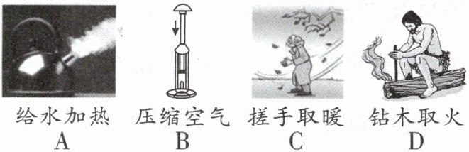 给水加热A 压缩空气B 搓手取暖C 钻木取火D