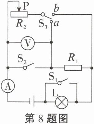 (2)当$S_1$、$S_2$均闭合,$S_3$接b,滑动变阻器$R_2$的滑片P移到最大阻值处时,灯泡L被短路,$R_1与R_2$并联,此时通过$R_2$的电流:$I_2= \frac{U}{R_2}= \frac{6V}{60Ω}= 0.1A$,通过$R_1$的电流:$I_1= I-I_2= 0.4A-0.1A= 0.3A$,$R_1$的阻值:$R_1= \frac{U}{I_1}= \frac{6V}{0.3A}= 20Ω$;