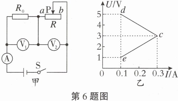 6. 如图所示,电源电压保持不变,闭合开关S,滑动变阻器滑片P从b点滑向a点的过程中,两个电压表示数随电流表示数变化的图像如图乙所示。图乙中