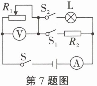 7. (2024 重庆)将标有“2A”但最大阻值未知的滑动变阻器$R_1$、阻值为15Ω的$R_2$和标有“2.5V 1.25W”的灯泡L(不计灯泡电阻变化)接入如图所示的电路,其中电源具有6V和另一电压未知的挡位,电压表量程为0~3V,电流表量程为0~0.6A。灯泡的额定电流为