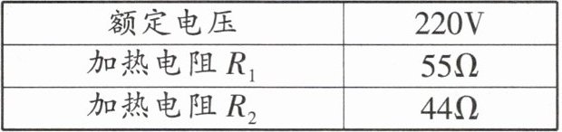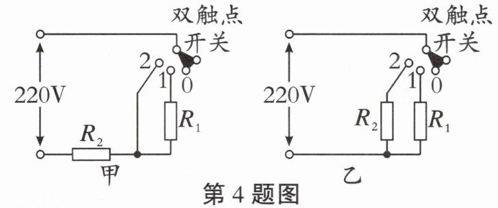 4.彤彤家里有一台电热锅,它的一些参数如表所示,加热功率有高、低两个挡位,其内部简化电路如图甲所示。[$c_{水}= 4.2×10^{3}J/(kg·^{\circ}C)$](1)电热锅在高挡位工作时的额定功率是多大?(2)若将锅中0.5L的水从$23^{\circ}C加热到100^{\circ}C$,水吸收了多少热量?(3)上述加热水的过程中,不计热量损失,电热锅高挡位需正常工作多长时间?(4)爱动脑的彤彤把原电热锅内部简化电路设计成如图乙所示,也有高、低两个挡位。已知该电热锅允许通过的最大电流为8A,请判断图乙电路是否合理,并通过计算说明原因。