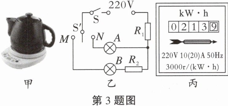 3.如图甲所示为小艺同学家的电中药壶,有“猛火”和“文火”两个挡位,工作电路简化为图乙所示,其中S'为挡位开关,$R_{1}$、$R_{2}$为发热电阻(假定工作时电阻不变),A、B为阻值可忽略不计的指示灯。当电中药壶处于“猛火”挡时,红灯亮;处于“文火”挡时,绿灯亮。已知电中药壶额定电压为220V,“猛火”挡的额定功率为2420W,$R_{2}$的阻值为180Ω。(1)请判断A灯是“红灯”还是“绿灯”,你的判断依据是什么?(2)求电中药壶“文火”挡的额定功率;(3)某天用电高峰时,小艺用电中药壶帮奶奶熬药,为了计算家里电路的实际电压,她关了家里其他用电器,只将电中药壶调到“猛火”挡上,电中药壶工作1min,电能表(如图丙所示)的表盘转了100转,由此她计算出家庭电路的实际电压是多少?