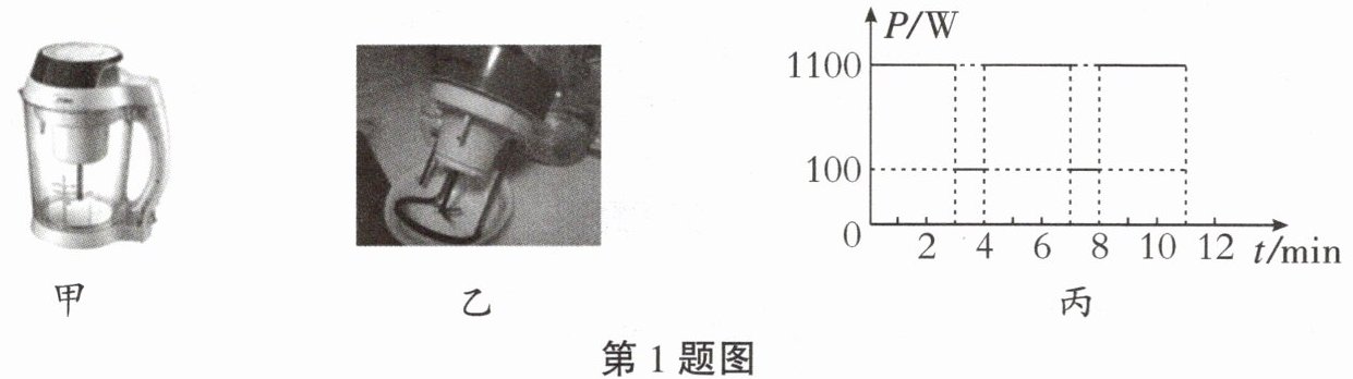 1. 如图甲所示的豆浆机,其主要结构如图乙所示:中间部分是一个电动机,用来将原料打碎;外部是电热管,用来给豆浆加热。图丙是豆浆机正常工作、完整做一次豆浆的过程中电热管和电动机交替工作的P-t图像,下表是其主要额定技术参数。