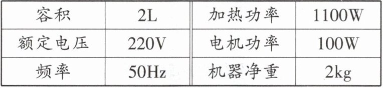 (2)由图像可知,豆浆机正常工作做一次豆浆,电热管工作的时间:$t_1$= 9min= 540s,电动机工作的时间:$t_2$= 2min= 120s,电热管消耗的电能:$W_1= P_1t_1= 1100W×540s= 5.94×10^5J$,电动机消耗的电能:$W_2= P_2t_2= 100W×120s= 1.2×10^4J$,则豆浆机正常工作做一次豆浆消耗的电能:$W= W_1+W_2= 5.94×10^5J+1.2×10^4J= 6.06×10^5J$;