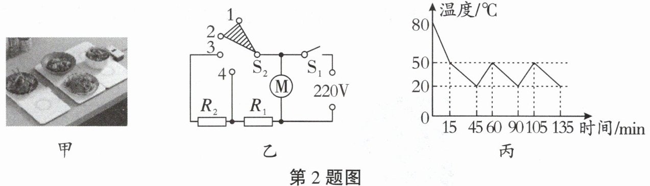 2. (2024重庆西附月考)如图甲所示是多功能暖菜板,为防止桌面被烫坏,内置了风扇,其简化电路图如图乙所示,$R_1$、$R_2$为电热丝,$R_1$= 24.2Ω。闭合开关$S_1$,只有内置风扇工作时,功率为176W;当板上食品降温到50℃时,$S_2$可自动切换让菜板进行保温,保温时电热丝的总功率为500W;当板上食品降温到20℃时,$S_2$会再次自动切换让菜板进行加热。