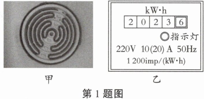 1. 寒假期间,小丽在外婆家发现一闲置的旧电炉(如图甲),铭牌上标有“220V 484W”的字样,电炉只有一根电阻丝。为检测电炉能否工作,她将其单独接入家庭电路中,观察到表盘如图乙所示的电能表的指示灯在120s内闪烁了16次,忽略温度对电阻的影响。