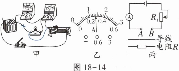 16.(2024重庆八中模拟)如图甲所示是小鲁测量小灯泡电功率的实验电路,电源电压恒为6V,小灯泡$L_1$的额定电压是2.5V,小灯泡$L_1$正常发光时电阻约为10Ω,滑动变阻器标有“20Ω 1A”字样,电流表、电压表、开关各一个,导线若干。(1)检查发现电路中有一根导线连接错误,请在图甲中,将连接错误的那根导线上画“×”,并用笔画线代替导线将电路连接正确。(如图)(2)正确连接好电路后闭合开关,小鲁发现电压表有示数,电流表无示数,小灯泡不亮,电路的故障可能是( )A.小灯泡$L_1$短路B.滑动变阻器短路C.小灯泡$L_1$断路D.滑动变阻器断路(3)排除故障后,小鲁移动滑片至某一位置时电压表的示数为2.2V,为使小灯泡$L_1$正常发光,应将滑片向_____(选填“左”或“右”)移动,直到小灯泡正常发光,此时电流表示数如图乙所示,则小灯泡$L_1$的额定功率为_____W;小鲁发现小灯泡$L_1$上标定的额定功率值与测量值有一定差距,他仔细观察所用的小灯泡后找到了原因,可能是因为小灯泡在频繁使用后,灯丝发生升华现象而导致灯丝的电阻变_____(选填“大”或“小”)。(4)小鲁同学想继续利用现有器材测量另一灯泡$L_2$的额定功率,他将灯泡$L_2$替换灯泡$L_1$接入图甲的电路中,已知灯泡$L_2$的额定电压为1.5V,灯泡$L_2$正常发光时电阻约为12Ω。但闭合开关后,发现无论怎样移动滑片,电压表的示数始终_____(选填“大于”“小于”或“等于”)1.5V。为了完成实验,可采取的具体措施:更换规格为“36Ω 1A”的滑动变阻器(要写出新元件的规格要求)。(5)雷老师告诉小鲁同学,他还可以尝试制作一个直接测量电阻的仪器——欧姆表,其原理如图丙所示,如果电源两端电压恒定不变,制作步骤如下:①在A与B之间连接导线,调节滑动变阻器$R_1,$使电流表示数为I₀,把电流表的“I₀”刻度线标为“0Ω”;②保持滑动变阻器$R_1$的阻值不变,当在AB之间接一个阻值为20Ω的电阻时,电流表示数变为I₀的二分之一,并将此时所指刻度线标为“20Ω”,则当电流表刻度变为I₀的五分之一时,应将此时所指刻度线标为_____Ω。