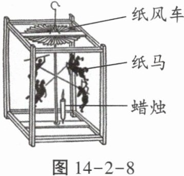 8.如图14-2-8所示是我国传统的“走马灯”。点燃底部蜡烛,在热空气上升驱动扇叶转动的过程中,能量的转化方式是