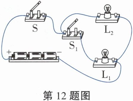 12. 如图所示,用笔画线代替导线按要求连接电路。要求:当只闭合开关S时,灯泡$L_2$发光;当闭合开关S、$S_1$时,灯泡$L_1$、$L_2$均发光;当只闭合开关$S_1$时,灯泡$L_1$、$L_2$均不发光。(如图)_____