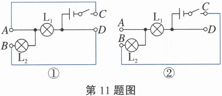 11. 如图所示的电路图,A、B、C、D是四个接线柱。请按照不同要求,用笔画线代替导线连接相应的接线柱,分别形成完整的电路图。要求:①图使灯$L_1$、$L_2$并联;②图使灯$L_1$、$L_2$串联。(如图)_____