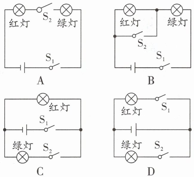 4. (2024通辽)某交通路口指示车辆通行的信号灯由红灯和绿灯组成,红灯停,绿灯行,以下是红、绿灯工作时的电路简图。你认为正确的是