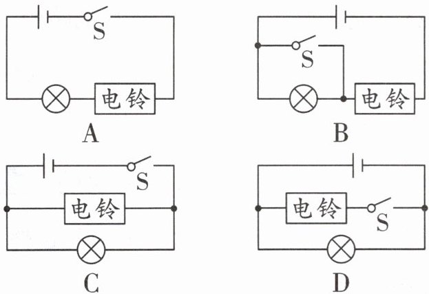 5. (2024天津)某兴趣小组要为居家老人设计一个“应急呼叫器”电路,要求:开关断开时,电灯和电铃均不工作;开关闭合时,灯亮铃响,即使电灯因断路不亮,电铃仍可工作。下图所示的电路中,符合设计要求的是